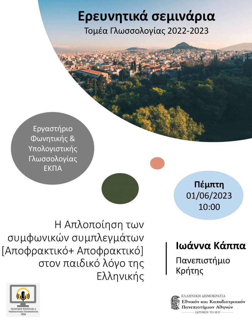 Στο ερευνητικό σεμινάριο του Εργαστηρίου Φωνητικής και Υπολογιστικής Γλωσσολογίας του ΕΚΠΑ, η Ιωάννα Κάππα θα παρουσιάσει κατόπιν πρόσκλησης στους φοιτητές/φοιτήτριες Γλωσσολογίας ένα ερευνητικό θέμα από το έργο VarΙphoΝ με τίτλο: ‘Η απλοποίηση των συμφωνικών συμπλεγμάτων [Αποφρακτικό+Αποφρακτικό] στον παιδικό λόγο της Ελληνικής.’ (1 Ιουνίου 2023, ώρα 10.00 πμ)
