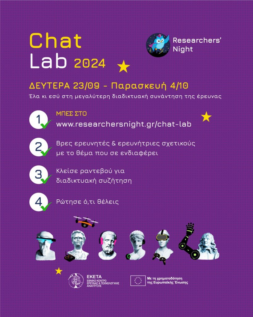 Στο πλαίσιο της Βραδιάς του Ερευνητή διοργανώνεται η δράση Chat-Lab (23/9-4/10), όπου συμμετέχει και η Καθηγήτρια Ιωάννα Κάππα, διευθύντρια του Εργαστηρίου Γλωσσολογίας-Π.Κ. και επιστημονικά υπεύθυνη (Ε.Υ.) του ερευνητικού προγράμματος