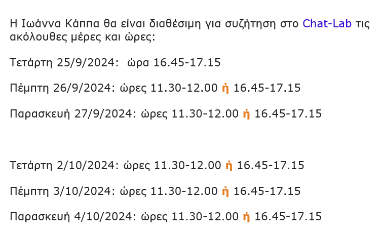 - Στο πλαίσιο της δράσης Chat-Lab η Ιωάννα Κάππα θα συζητήσει με τους μαθητές/τις μαθήτριες του Γενικού Λυκείου Σκύδρας (νομός Πέλλας) σχετικά με την έρευνα για τη φωνολογική κατάκτηση και ανάπτυξη των νηπίων. Πέμπτη 26/9/2024, ώρα 11.30-12.00.